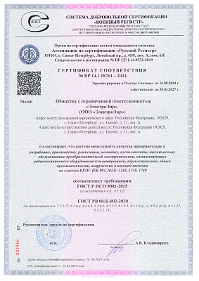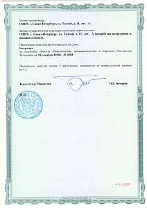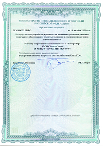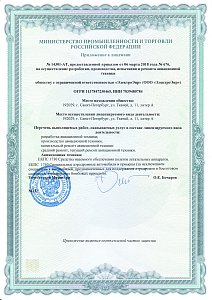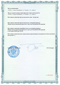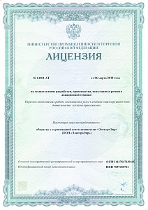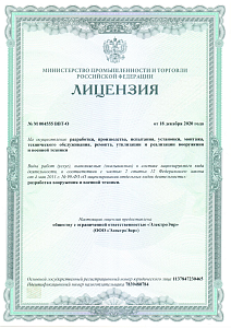 Лицензия Минпромторг РФ на право осуществления видов деятельности, подлежащих обязательному лицензированию, в соответствии с частью 2 статьи 12 Федерального закона от 04 мая 2011 г. №99-ФЗ "О лицензировании отдельных видов деятельности" на осуществление разработки, производства, испытания, установки, монтажа, технического обслуживания, ремонта, утилизации и реализации вооружения и военной техники.